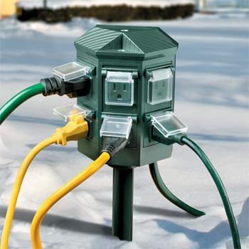 Power your Christmas or landscape lights, water-garden pumps and more easily with this outdoor power center. All six outlets of the outdoor timer are controlled by the automatic timer. Use it as a 7-day timer with up to six on/off cycles per day (set for daily, weekday, or weekend); or let the photocell turn the Outdoor Timer Power Strip on at dusk, off 1 to 12 hours later or at dawn. Rainproof covers protect the outlets, digital display, and programming keyboard of this outdoor timer, and there's also a manual on/off switch. The Outdoor Timer Power Strip includes backup Ni-Cad battery for timer, heavy-duty 10' grounded cord, and swivel stake. 19"H overall with stake. Benefits of the Outdoor Timer Power Strip:6-outlet outdoor power center includes a 7-day digital timer Outdoor Timer Power Strip offers a wide variety of programming options Waterproof outdoor timer turns holiday or landscape lights on automatically, saving you the trouble!